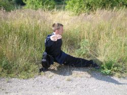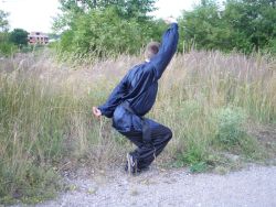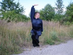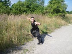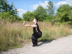 Jedna noha je pokrčená tak, aby stehno bylo vodorovné se zemí. Druhá noha je natažená před sebe. Obě chodidla svírají s tělem úhel 45°.Koleno natažené nohy je lehce pokrčené. Natažená noha je jemně stočená dovnitř postoje a země se dotýká pouze palec natažené nohy. Noha je stočena tímto způsobem z důvodu permanentního krytu na genitálie bojovníka. Pánev je ve výšce pokrčeného kolena. Záda jsou narovnaná, ale tělo je lehce šikmo dopředu. Krk je opět narovnaný. Váha těla je rozprostřena tak, aby na pokrčené noze bylo 80% váhy těla a na natažené noze zbylých 20%.